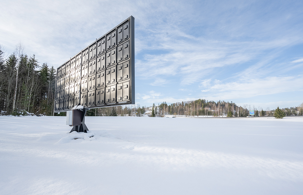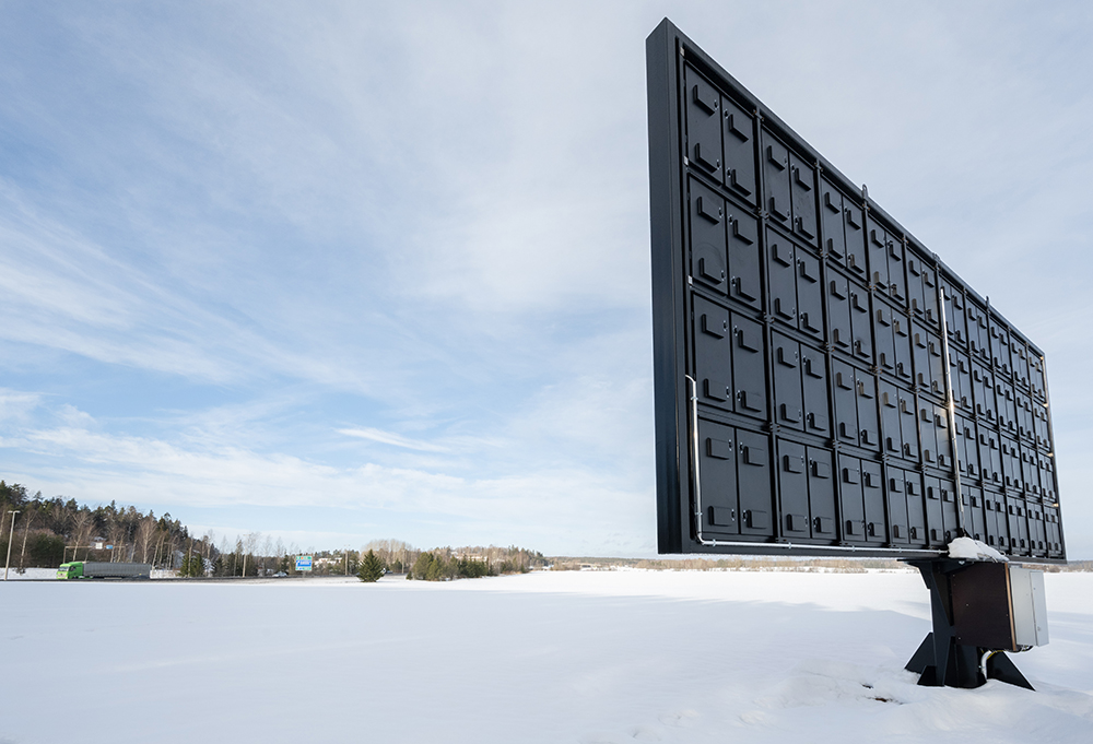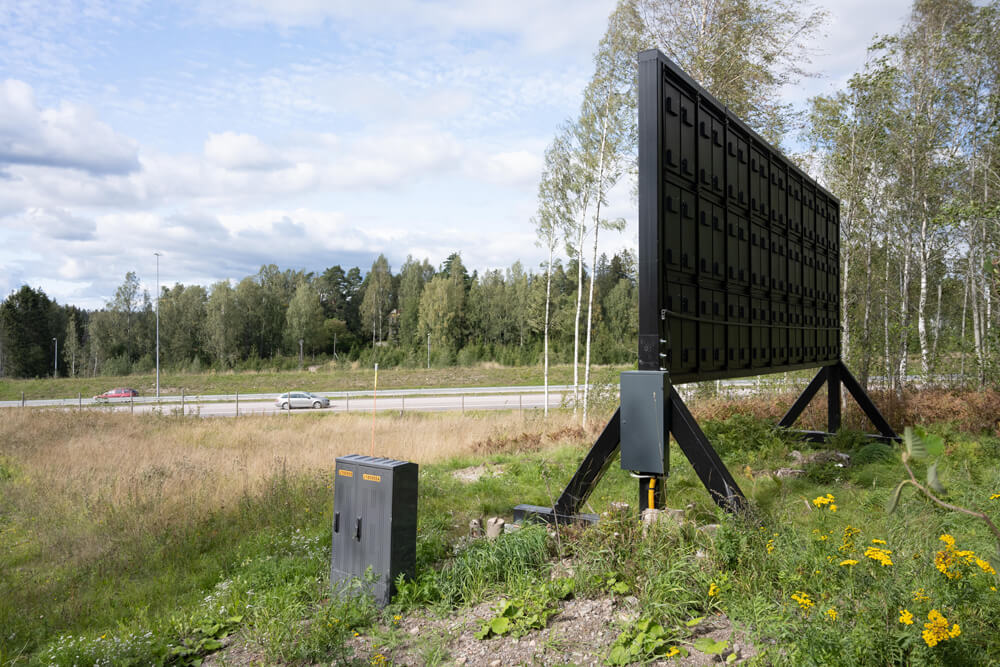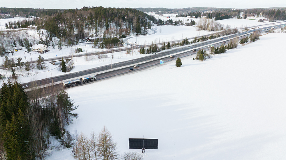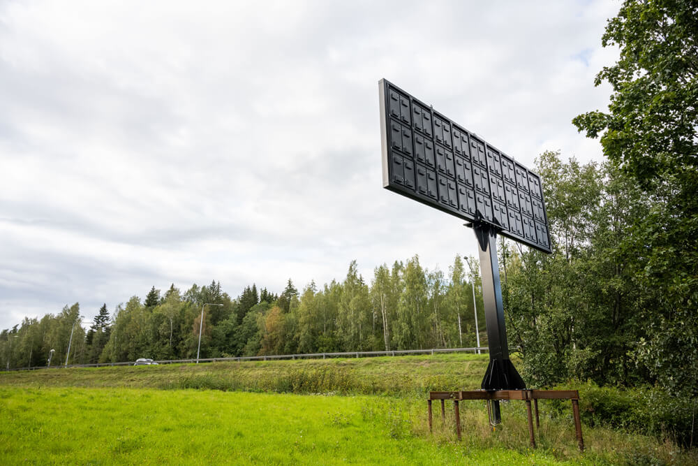 Denna skylt är vid Raseborgs Energis solpark i körriktning mot Hangö