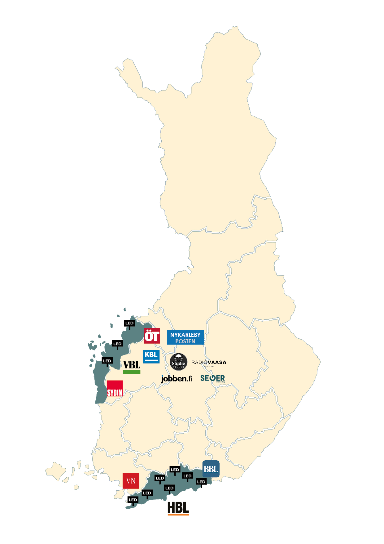 Bonnier News Finland julkaisee maan suurimpia ruotsinkielisiä sanomalehtiä eli Hufvudstadsbladetia ja Vasabladetia. Tämän lisäksi mediatalo julkaisee paikallislehtiä Borgåbladet, Västra Nyland, Österbottens Tidning ja Syd-Österbotten. HBL Juniorin kautta tavoitetaan lapset, ja Suomen ainoa kaksikielinen paikallisradio Radio Vaasa vastaa radiotarjonnasta. Mainostoimisto Seger Marketing tarjoaa ainutlaatuisia markkinointiratkaisuja.